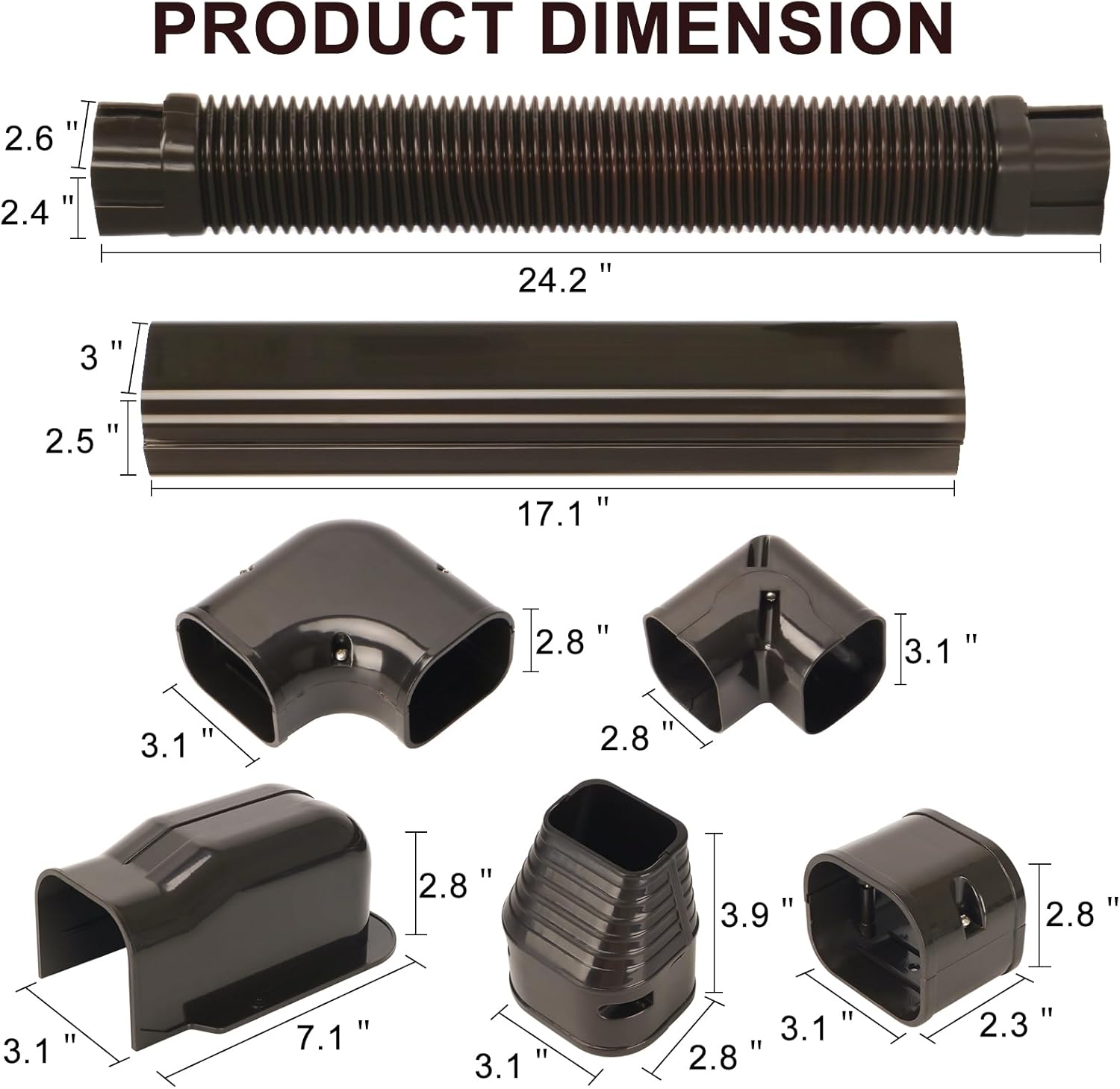 Product Description: Material: high-quality PVC with heat resistant -40-140℃ Dimension:4’’width*9 Feet (5*1.41 feet straight ducts+1*2 feet flexible ducts) Easy to install 1. Drill the frame to the outside wall where the line set comes out from the indoor unit and connects to the outdoor unit. 2. Screw the frame to the outside wall, and then use the provided zip ties to secure the line set to the frame. 3. Secure the top into place, and then snap on all the other pieces simply. You can also use elbow piece to install at an angle. Package includes: *5 x 1.41 ft straight ducts *1 x 2 ft flexible duct *1 x wall cover *1 x End Cap *4 x Coupling