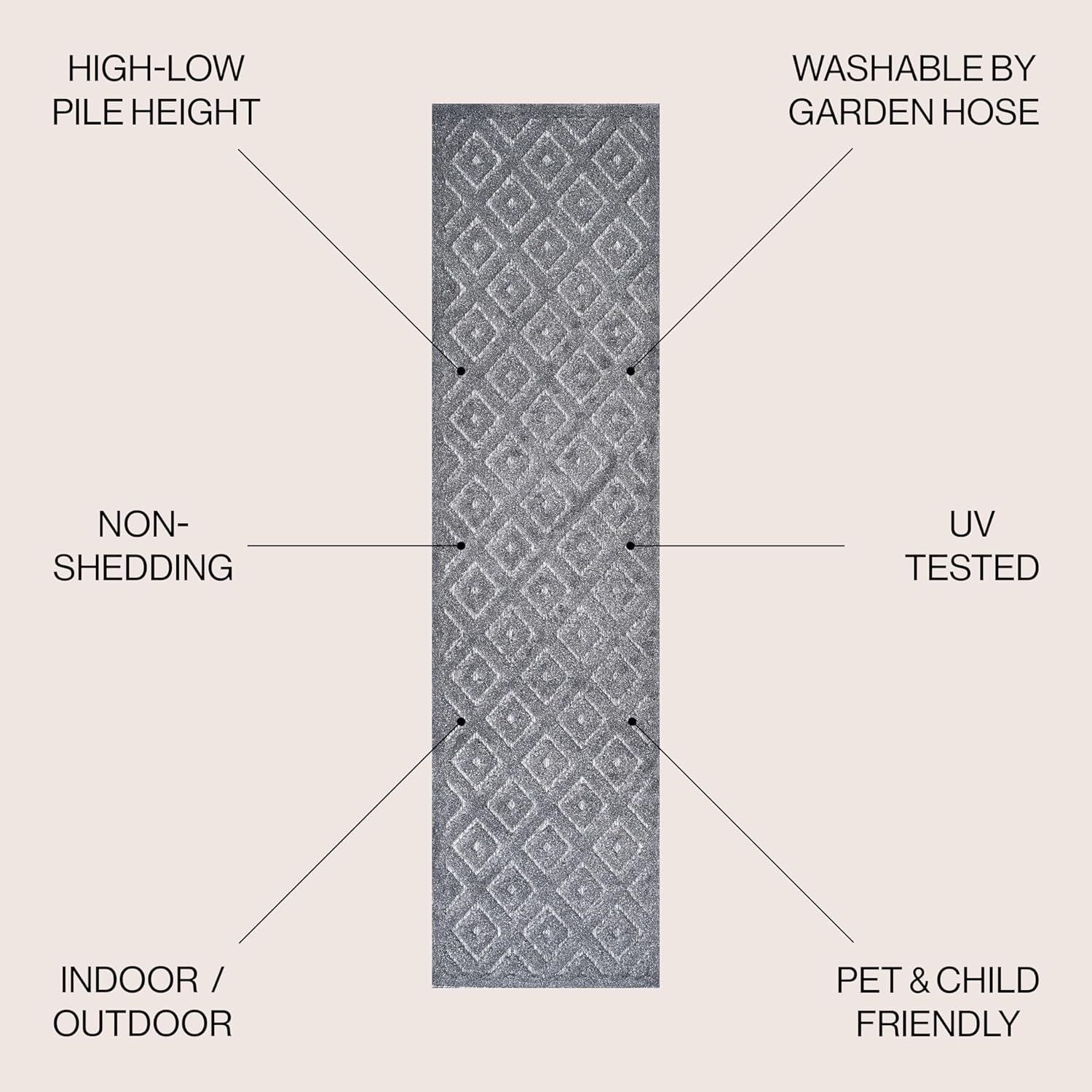 Inspired by traditional Mediterranean tile floors, this neutral indoor/outdoor rug adds subtle, elegant pattern to your porch, patio or sunroom. Mingled navy and denim threads give the geometric pattern a vintage feel that's perfect for an entry, kitchen, hallway, living room or bedroom. The pet-friendly and kid-proof low pile design makes it easy to clean, and perfect for the modern beach house.