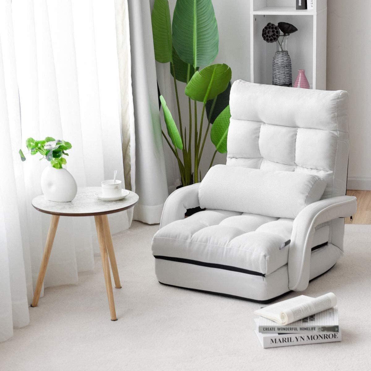 Description:Our five-position adjustable floor sofa chair will enhance the comfort of your leisure time!The backrest of the floor sofa chair can be adjusted in five positions between 90°-180° to provide you with the most comfortable angle. The cushion of the floor sofa chair is also removable to meet the needs of people of different heights. The floor sofa chair is equipped with lumbar support with massage function and armrests for full body relaxation to ensure comfort. The floor sofa chair is made of high-quality sponge, cloth and iron frame to ensure breathability, stability and weight-bearing capacity with long service life. A foldable floor sofa chair that doesn't take up too much space when not in use!Don't hesitate! Bring it home soon!Features:Lumbar cushion with 2 massage points for relieving lumbar muscle fatigueFive-position adjustable backrest allows both sitting and lyingRemovable cushion to meet the needs of people of different heightsArmrests to ensure the comfort of sittingIron frame ensures excellent stability and load-bearing capacityHigh-quality fabrics and sponges ensure breathability and comfortSuitable for reading, watching TV, playing games, etcFoldable design not taking up too much spaceNo-assembly design for ease of useSpecifications:Color: Blue/ Red/ WhiteMaterial: Cotton, Fabric, Sponge, IronOverall Dimension: 22” x 21.5” x 27.5” (L x W x H)Voltage: 5VWeight Capacity: 330 lbsNet Weight: 24 lbsPackage Includes:1 x Floor Chair1 x User Guide