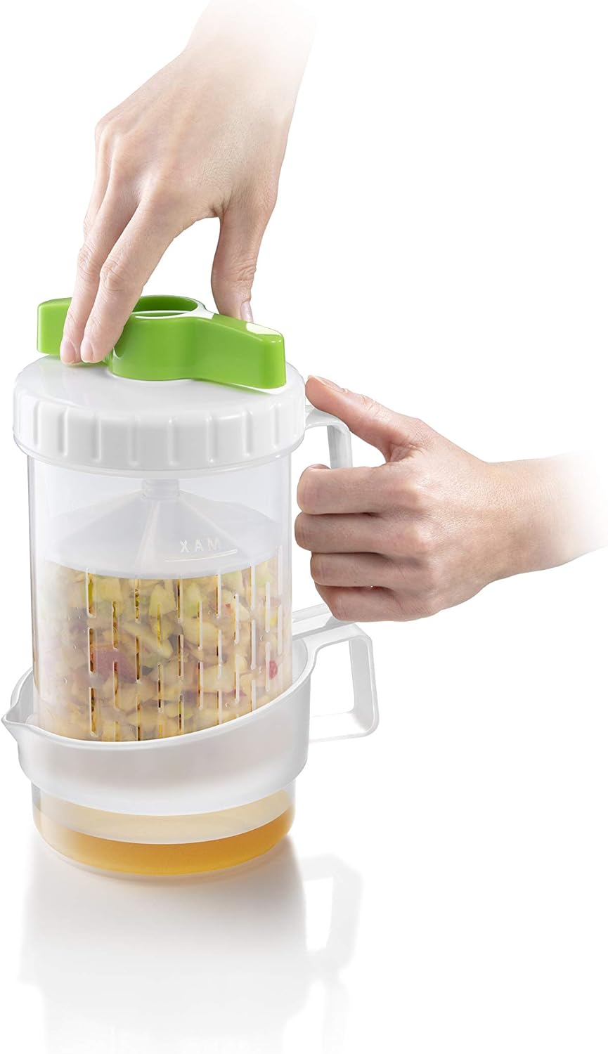 Great for preparing apple juice extracted from grated apples. Apples in the Handy apple juicer do not come into contact with metal materials, the juice does not lose vitamins and remains fresh longer. Also suitable for squeezing excess liquid from grated potatoes and cucumbers when preparing potato pancakes and tzatziki. Made of durable plastic. Dishwasher safe